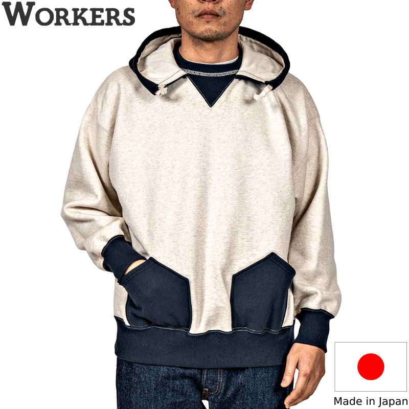 左右二つに分かれた「セパレートポケット。通称「セパポケ」 パーカーというと、真ん中がつながった大きいポケット(カンガルーポケットなどとも呼ばれますが)がメジャー。 最初に、この左右分かれたポケットを見たのはビンテージを本で見たのかな? なんで割れてるんだろう?と思ったものです。 ただ、人間の常識で、もともとジャケットについているパターンは、当然、左右別々なのだから、パーカーにつけるポケットも左右別々が「普通」だったのでしょう。 それを、誰かが「これ、真ん中寄りにして一つにしたら裁断も楽だしいいんじゃないか?」とか「いや、パーツが大きくなるから、生地必要量増えない?」とか「ポケット位置が真ん中過ぎておかしくない? せめて真ん中にステッチ入れて割る?」とか。 色々考えて、結果、「真ん中一つポケットいいじゃん」となっていったのでしょうね。 WORKERS オフィシャルサイト抜粋 | ||