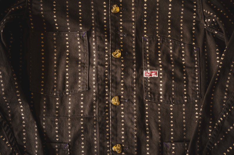 TCB jeans の Cathartt Chore Coat Brown Paw Stripe です。 ハートのチェンジボタン、肉球とハートのストライプが特徴的です。 一見するとクラシックなジャケットに見えますが、良く見ると可愛いという二面性を持ったジャケットになります。 |