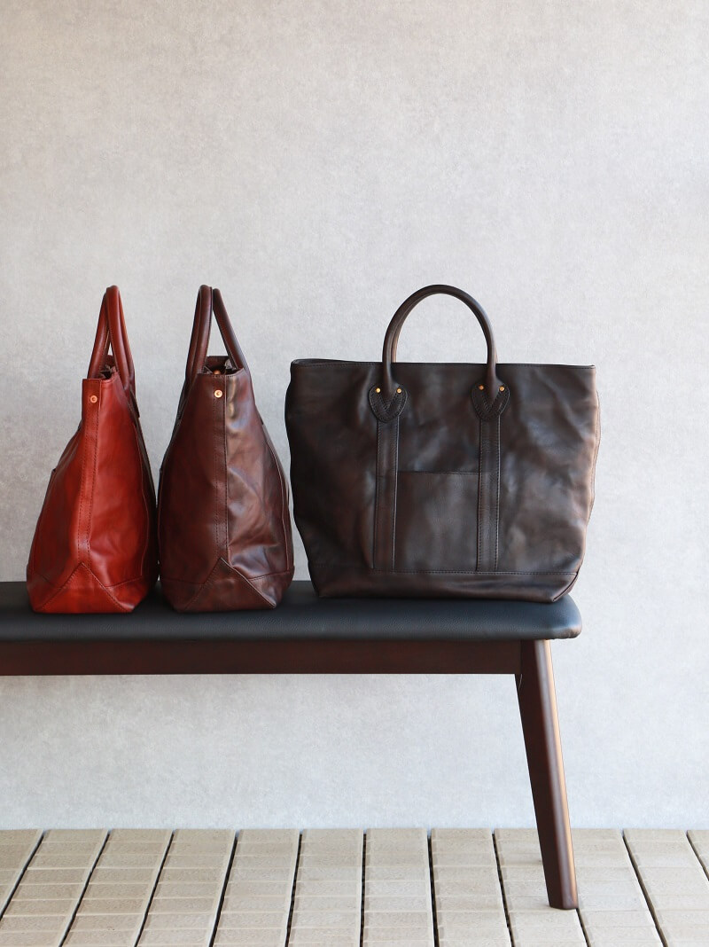 姫路産のフルベジタブルタンニンレザーを丘染めと呼ばれる伝統的な手染め製法で染め上げ、コガシ加工、オイル加工を施し、ヴィンテージのような風合いに仕上げたブランドを代表するシリーズ。